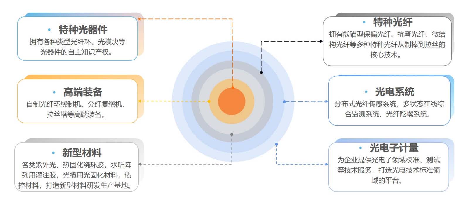 公司坚持“5+1聚焦同心圆”的产业战略,突破国外封锁解决“卡脖子”问题,不断丰富产品线,提升持续发展能力,建立了涵盖光纤环器件(含光模块)、特种光纤(含特种光缆)、胶粘剂和涂覆材料、光器件设备及其他附件备件产品和服务在内的完整业务布局。