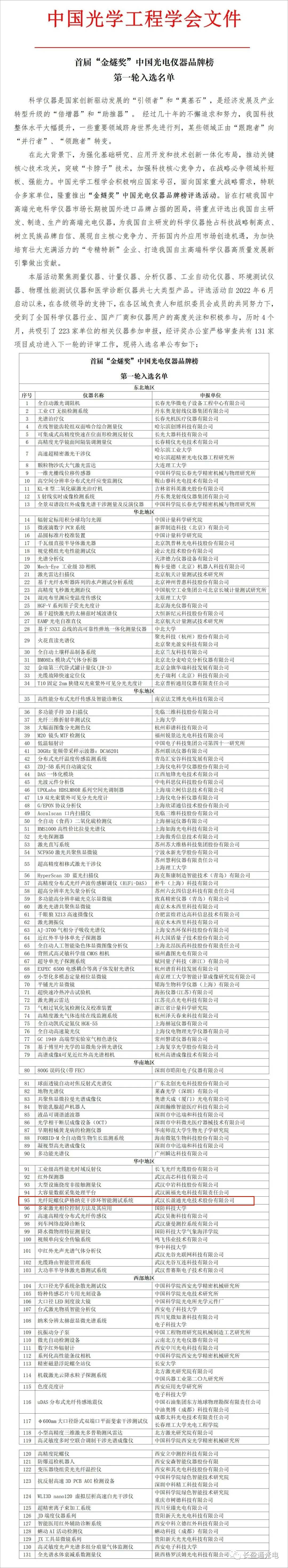 本届活动聚焦测量仪器、计量仪器、分析仪器、工业自动化仪器、环境测试仪器、物理性能测试仪器和医学诊断仪器共七大类型产品。评选活动自2022年6月启动以来,在各级领导的支持下,在各区域负责人和组织委员会成员的共同努力下,受到了全国科学仪器行业、国产厂商和仪器用户的高度关注和积极参与,历时4个月,共吸引了223家单位的相关仪器参加申报,经评奖办公室严格审查共有131家项目成功入选下一轮的评审工作,附入选名单公布如下: